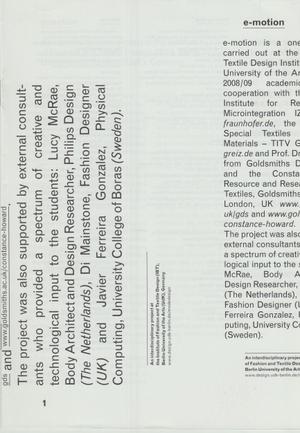 3 e-motion An interdisciplinary project at the Institute of Fashion and Textile Design (IBT), Berlin University of the Arts (UdK), Germany 5 dis.appear - Theresa Lusser 9 Outsourcing - Max Schath 13 White Pages - Daniel Schulze, Hanna Wiesener 17 Shift - Merlin Dunkel 21 Hap.tickle Greeting - Lina Saleem 25 Over_All - Robert Zeise 29 Intimacy - Sigrun Kempter 33 Pneuma - Synne Geirsdatter Frydenberg